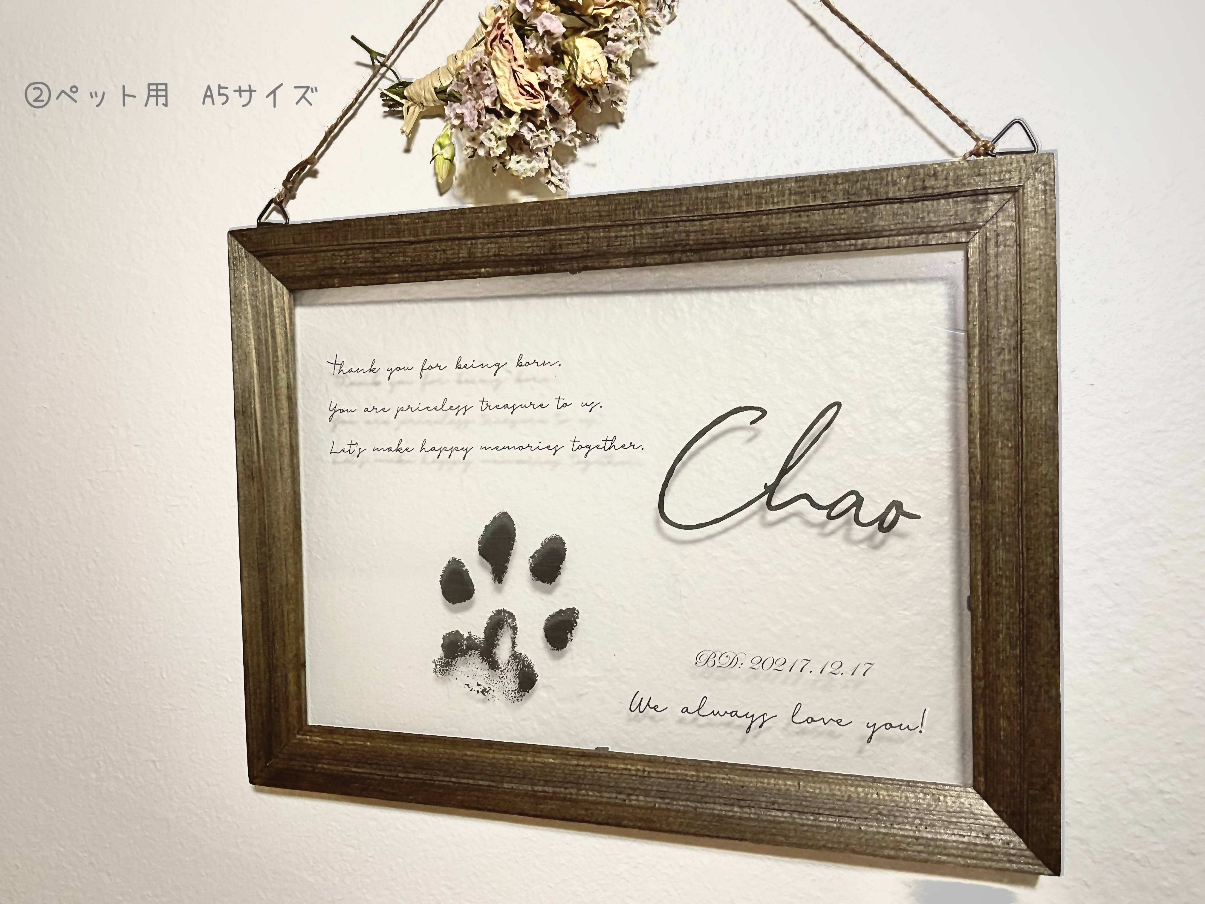 背景が透き通るクリアポスターA5サイズ(フレームなし) ”ペットのお迎え記念。命名記念やお誕生日記念などに。 ペット専用デザイン” 肉球が中心のデザインです。 基本構図:肉球1つ〜3つくらい A5に入る限りデザインは柔軟に対応します。 複数頭飼育されていてA4サイズをご希望の場合はお問い合わせください。 お名前、肉球、メッセージ、日付が入ります。 ●サイズ A5 ●仕様 薄い透明フィルムに印刷。より美しく飾っていただくためにアクリル板付けています。 ●オーダーの流れ 商品を当サイトよりご購入 ↓ 当店よりご登録いただいたメールにオーダー内容記入フォームを送信致しますのでご記入いただき お家取っていただいた肉球や手形・足形の画像を添付してご返信ください。 ↓ ご記入いただいた内容を確認し、デザイン案をメールにて提示 ↓ ご納得いただけましたら、印刷、送付となります。 ご覧いただきありがとうございます。 トラブル防止のため、以下の注意点を必ずお読みください。 《注意点》 ※クリアポスターは指紋や水濡れに弱いため、手袋を付けて取り扱いいただくことを推奨いたします。 ※フレームははいりません(在庫があればオプションでお送りすることも可能です。) ※お写真はご自身でご用意ください。クリアポスターの性質上お写真がずれるようでしたら、マスキングテープなどで背面で止めてください。 ※家庭用インクジェットプリンターで印刷しております。ハンドメイド作品のため一点一点丁寧にお作りしておりますが、お届けした商品に破損や不備、商品の不足があった場合、商品到着後3日以内にご連絡ください。事実確認の上で、至急対応をさせていただきます。 ※受注生産作品のためご購入後のオーダー内容を双方で確認させていただいた後はキャンセルはご遠慮ください。 ーーーーーーーーーーーーーーーーーーーーーー 以下は作品内容について ※大人の方手形は実寸サイズで入りきらない場合はサイズを調整する可能性もあります。 ※①手足形ぺったんはお家で行っていただき(インクはご自身でご用意ください。おすすめをFAQでご案内しています)その写真データを添付ください。 ※②実寸サイズの場合、必ず定規を入れた写真もお送りください。 写真は全部で①と②の2枚を送ってください。 ※メッセージやお名前は英語でも日本語でも対応可ですが、翻訳は致しません。 サンプルはHOW TO ORDERをご参照の上、そちらから選んでいただいても構いません。